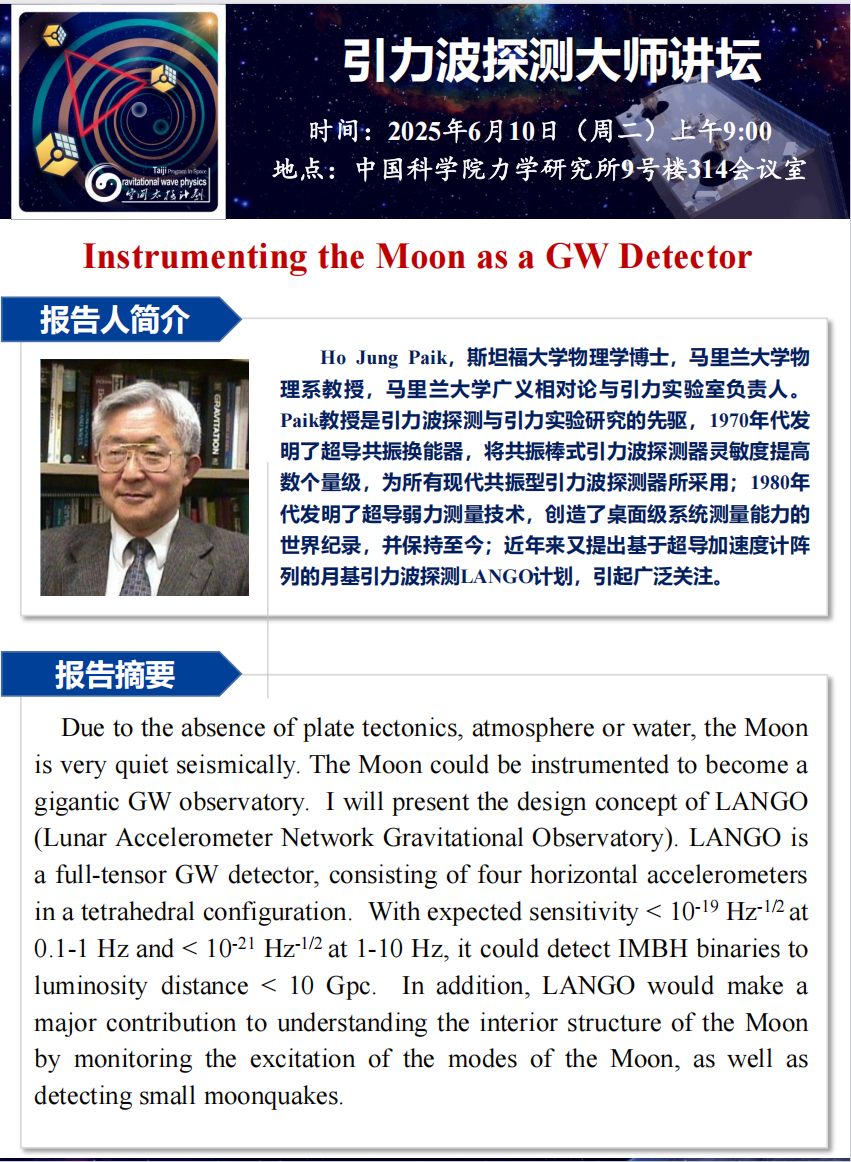 (NML引力波探测大师讲堂 2025年6月10日9:00 9号楼314会议室)Instrumenting the Moon as a GW Detector