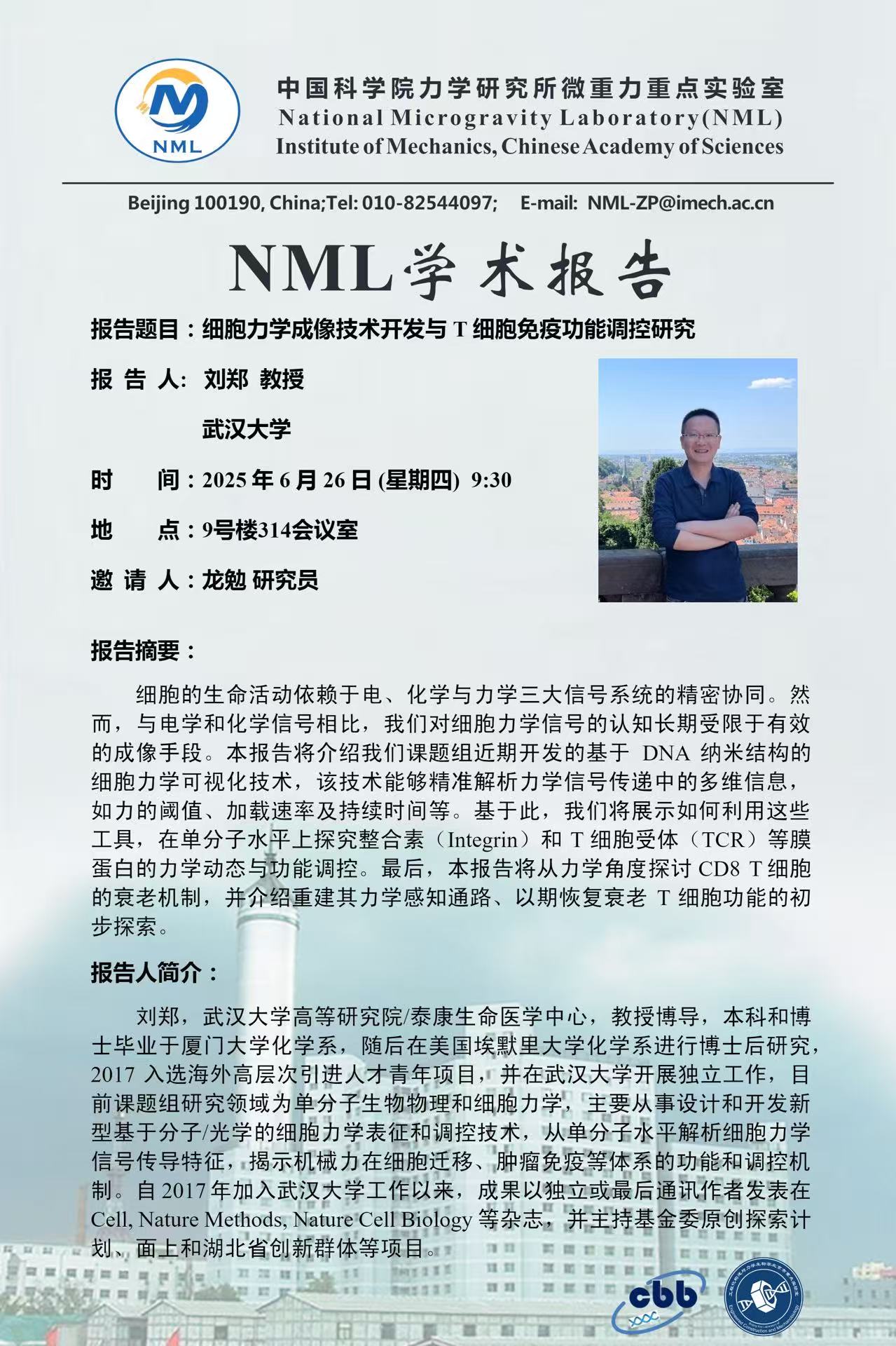 (NML 2025年 6月26日 09:30 9号楼314会议室)细胞力学成像技术开发与T细胞免疫功能调控研究