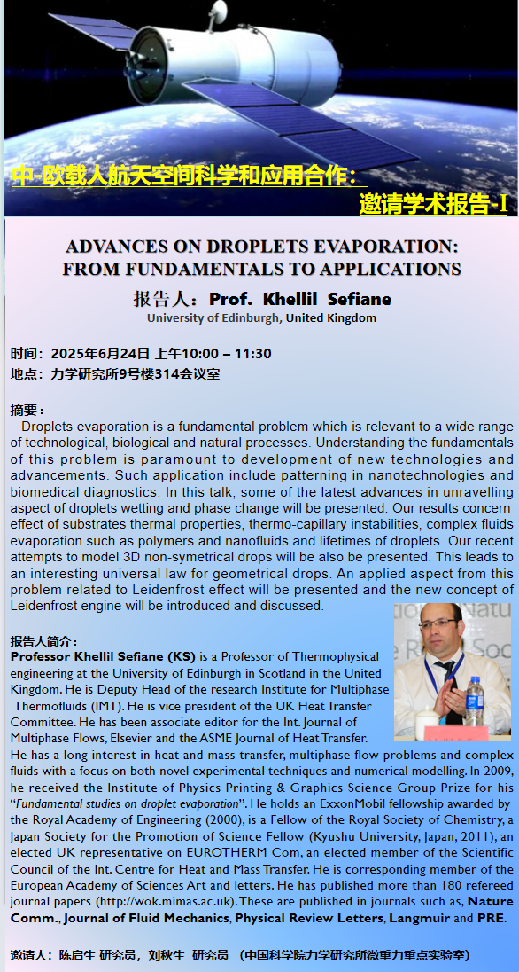 (NML 2025年6月24日 10:00 9号楼314会议室)ADVANCES ON DROPLETS EVAPORATION: FROM FUNDAMENTALS TO APPLICATIONS