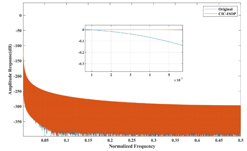 空间引力波探测主要关注在0.1mHz-1Hz的频段内引力波,要求距离测量达到1 pm/Hz1/2,对应的相位噪声水平为2π μrad/Hz1/2。目前国内外相位计的研究,噪声水平均能达到2π μrad/Hz1/2。但在空间引力波探测的角度传感中不仅对噪声水平提出了需求,同时对角度的绝对精度提出了严格限制。系统测角精度需达到10nrad,相对应的相位计抗混叠滤波器在0.1mHz~1Hz内的最大衰减需小于8.7×10-4dB。而现有相位计系统在对应频段内的最大衰减达到了0.1072dB,约有3个量级的差距,无法满足引力波探测需求。团队提出了CIC-ISOP的抽取滤波方案,使相位计在0.1mHz~1Hz内的最大衰减有了大幅度改善,满足引力波探测8.7×10-4dB的需求。